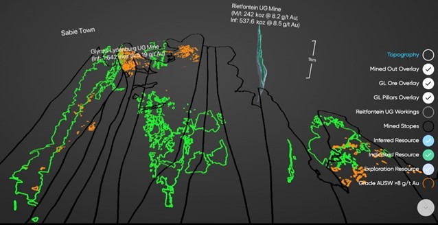 Figure 7: Glynn’s historic underground workings and the Rietfontein UG mine orebody (3D).