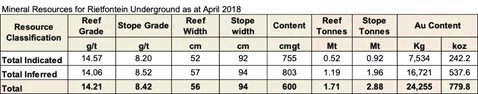 Table 2: JORC Resource at Rietfontein as at April 2018