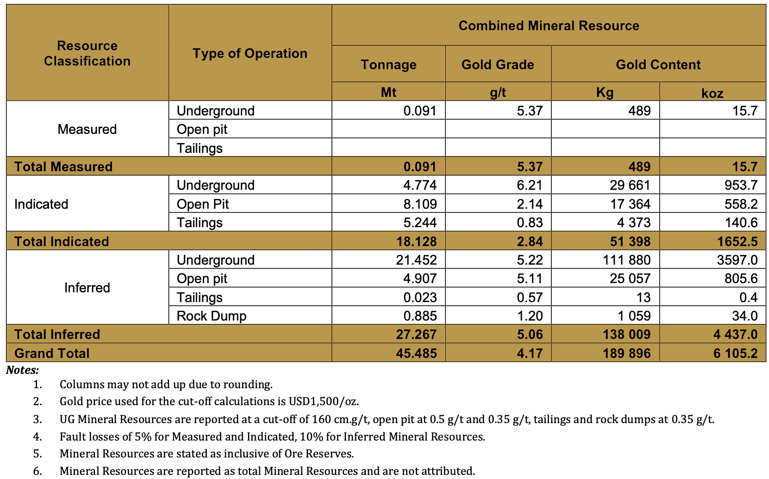 | Resource Classification | Type of Operation | Combined Mineral Resource | |||