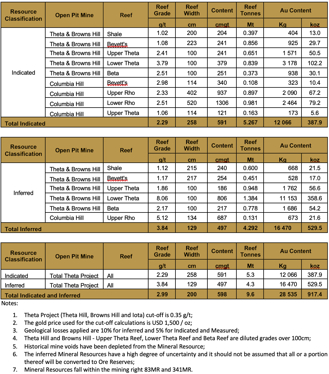Table 1: Combined Mineral Resources as at February 2021
